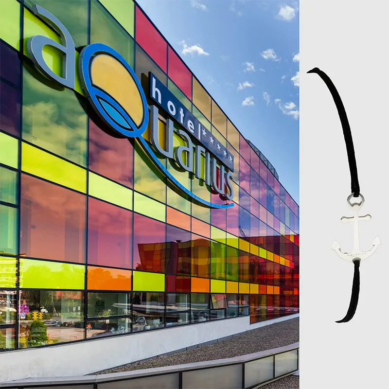 Bransoletki zaprojektowane dla ekskluzywnego pięciogwiazdkowego hotelu Aquarius w Kołobrzegu. Wycięte ze srebra 925 motywy, kojarzące się z nadmorskim wypoczynkiem – mewa i kotwica. Na srebrnych elementach naniesione w formie graweru bardzo dyskretne logo. Sznureczki w różnych kolorach.